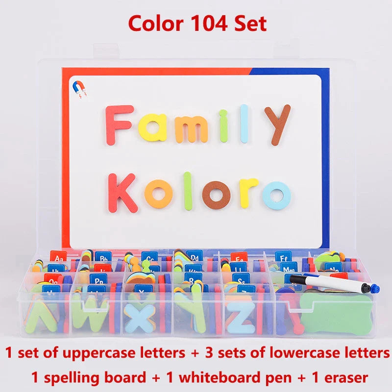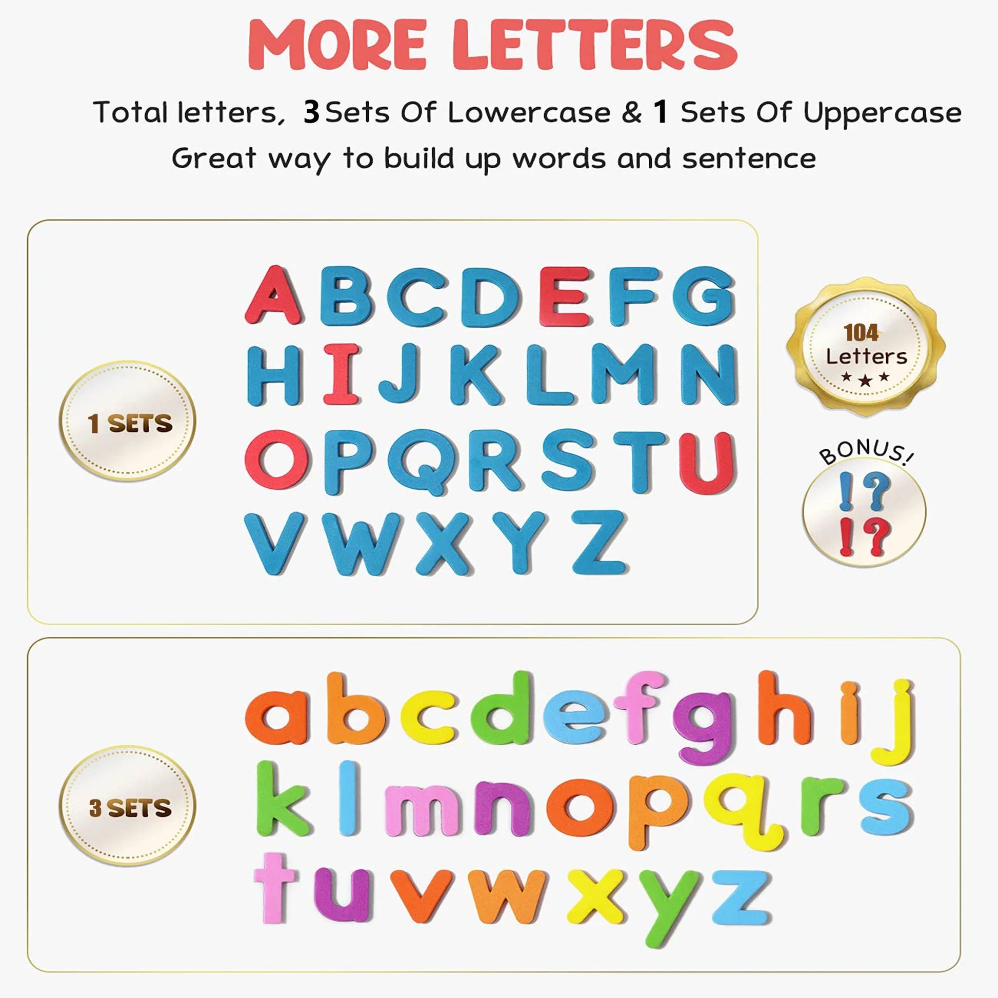 🔠 Complete Set for Learning: Choose between 104pcs or 208pcs sets, including uppercase & lowercase letters, symbols, a magnetic board, dry-erase pens, and an eraser.