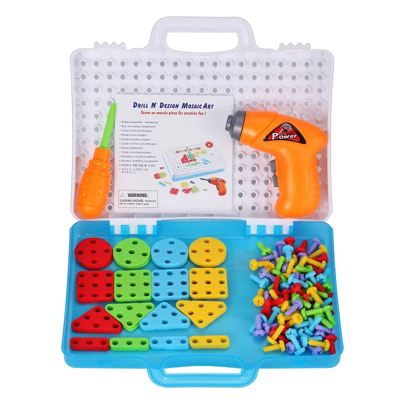 This fun and educational DIY set lets kids design and build their own 3D creations using colorful mosaic pieces and a real working (child-safe) electric drill — just like real builders!