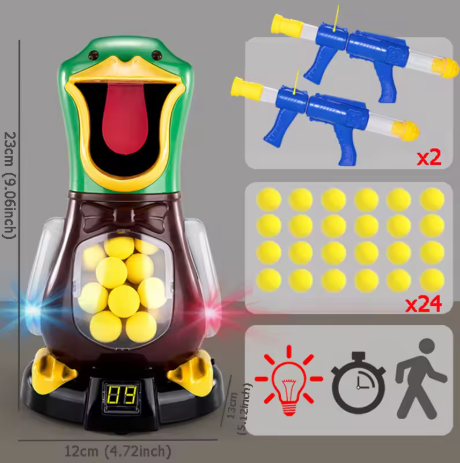 🦆 Interactive Duck Target – Every time a foam dart hits the duck’s tongue, the toy makes a fun sound, and the LCD screen keeps track of all the hits, making the game even more exciting!