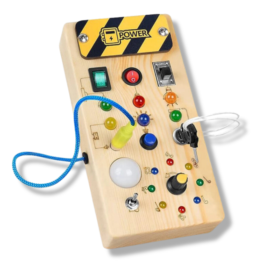 Discover the Montessori Activity Board – a great sensory wooden toy for children aged 2 to 4 years! Your child will love playing with the various switches, buttons, and LED lights while developing essential skills like fine motor skills and concentration.