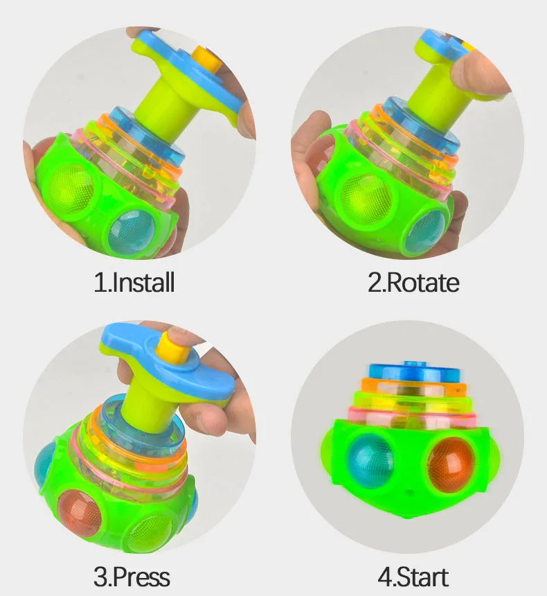 Get ready to light up playtime with the UFO Light-Up Spinning Top â a kid-friendly gyroscope toy that whirls, flashes, and plays music! Just twist, launch, and watch it spin into action with dazzling lights and exciting sounds.